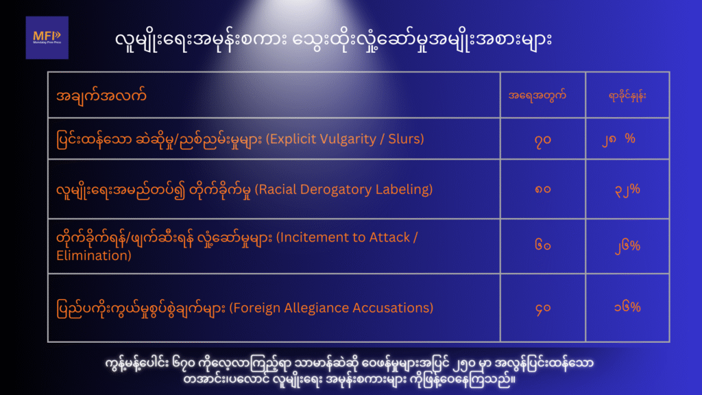 ဒီအချက်တွေအရ လူမျိုးရေးနဲ့ သွေးခွဲရေးကို ပစ်မှတ်ထားကာ အမုန်းစကား ဖြန့်ချိသူတွေ လို့ ယူဆနိုင်တဲ့ မှတ်ချက်ပေးသူတွေ များလာတာကို မြင်နိုင်ပါတယ်။