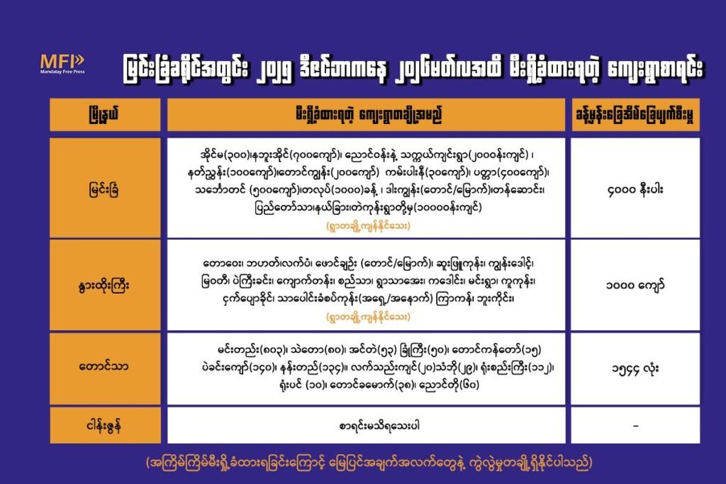 MFP က ပြုစုထားတဲ့ စာရင်းတွေအရ ပြီးခဲ့တဲ့ ဒီဇင်ဘာလကနေ မတ်လအထိ လေးလအတွင်း မြင်းခြံ၊ နွားထိုးကြီးနဲ့ တောင်သာမြို့နယ်အတွင်းက ကျေးရွာပေါင်း ၈၀ နဲ့ ၁၀၀ အကြားကို စစ်အုပ်စုက စစ်ကြောင်းထိုး မီးရှို့ခဲ့ပြီး အိမ်ခြေ ၆၀၀၀ ကျော် ပြာကျပျက်စီးခဲ့တာပါ။
