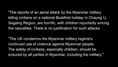 လူသစ်/MFP ၊ အောက်တိုဘာ – ၁၀ စစ်ကိုင်းတိုင်း၊ ချောင်းဦးမြို့နယ် ဘုံတိုရွာမှာ အောက်တိုဘာလ ၆ ရက်နေ့ သီတင်းကျွတ်လပြည့်နေမှာ ကျင်ူပနေတဲ့ ဆီမီးသပိတ်လှုပ်ရှားမှုကို လေကြောင်းကနေ ဗုံးကြဲသတ်ဖြတ်ခဲ့တဲ့ ဖြစ်ရပ်ဟာ လက်ခံနိုင်စရာမရှိကြောင်း ဗြိတိန်သံရုံးက ဒီနေ့မှာ…