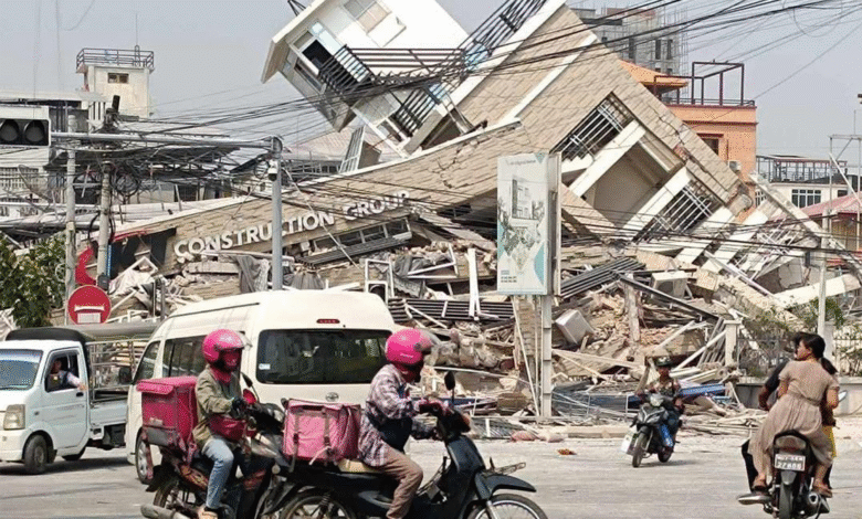 ငလျင်လှုပ်ခတ်ပြီးစ မန္တလေးမြို့ပေါ်က ပြိုလဲပျက်စီးသွားတဲ့ အဆောက်အအုံတစ်ခု/Photo – CJ