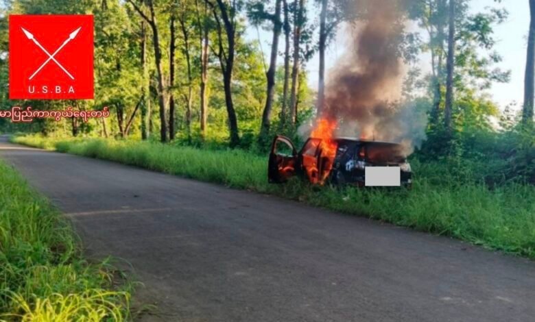 မကွေးတိုင်း၊ မင်းတုန်းနယ်မှာ ပုသိမ်-မုံရွာ လမ်းအတိုင်း ဖြတ်သန်းမောင်းနှင်လာတဲ့ အိမ်စီးကားပေါ်မှာ စစ်အုပ်စုတွေ လိုက်ပါလာတာကြောင့် စစ်အုပ်စုနဲ့တော်လှန်ရေးတပ်တွေ အပြန်အလှန်ပစ်ခတ်မှုဖြစ်ပွားခဲ့ပြီး ကားတစ်စီးနဲ့ စစ်အသုံးအဆောင်ပစ္စည်းတွေ သိမ်းဆည်းရမိတယ်လို့ United States Of Burma Army – USBA က သတင်းထုတ်ပြန်ပါတယ်။