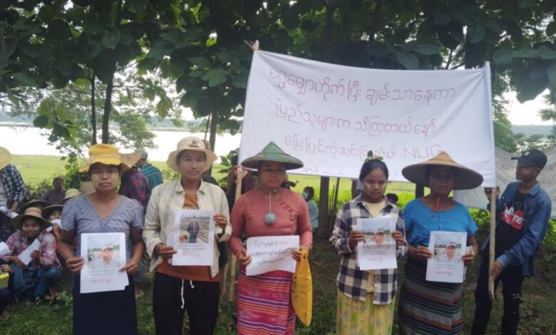 မင်းကင်းနယ် ချင်းတွင်းမြစ်ရိုးမှာ ရွှေတူးဖော်မယ့် အစီအစဉ်ကို ကန့်ကွက်ကြောင်း ဒေသခံတွေ ဆန္ဒပြနေစဉ်/Photo – ပေးပို့
