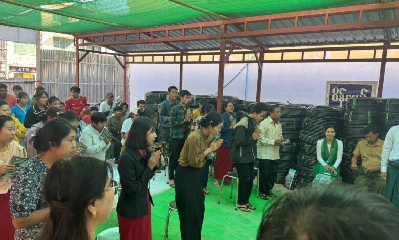 မန္တလေးမြို့ရှိ အလုပ်ရုံတစ်ခုက ပုဂ္ဂလိက ဝန်ထမ်းတွေကို စစ်ဗိုလ်ချုပ်ဟောင်းတွေနဲ့ ဖွဲ့စည်းထားတဲ့ ကြံ့ခိုင်ရေး ပါတီက မဲဆွယ်စည်းရုံးနေစဉ်/Photo – စစ်အုပ်စု