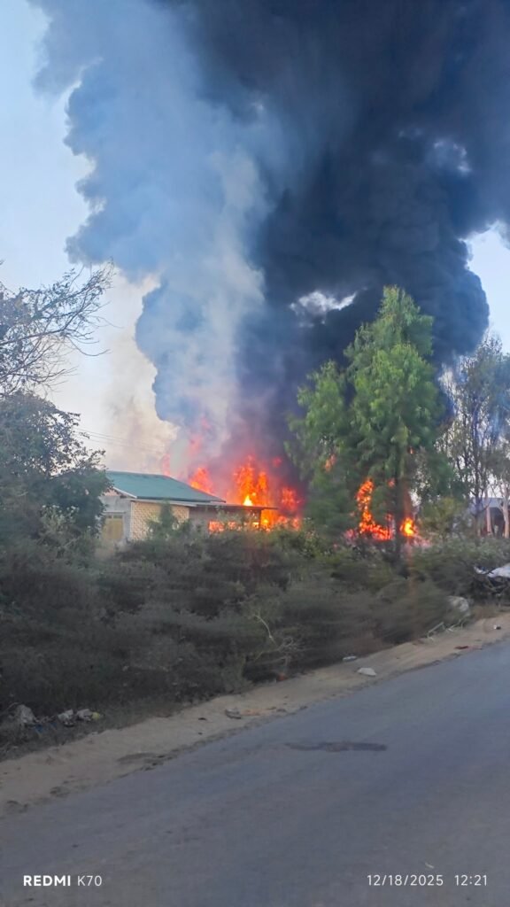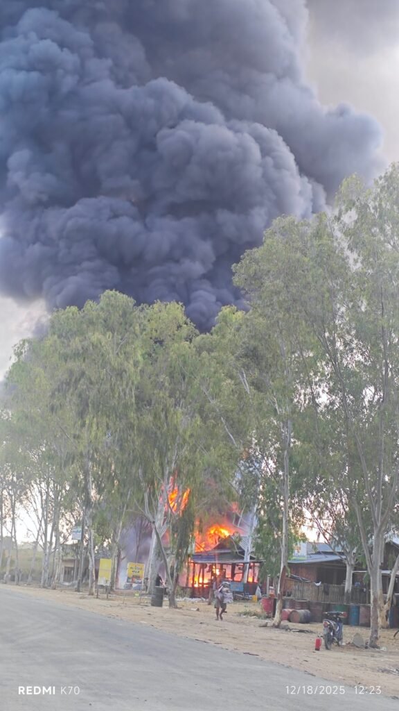 ခင်ဦးနယ်၊ ရွှေဘို – မြစ်ကြီးနား ဗျူဟာလမ်းကို အာဏာသိမ်း စစ်အုပ်စုက ပိတ်ဆို့ထားပြီးနောက် ခရီးသွားတွေ စုဝေးရာနေရာကို ဗုံးလိုက်ကြဲ သတ်ဖြတ်လို့ မီးလောင်နေစဉ်/Photo – ခင်ဦး ပအဖ