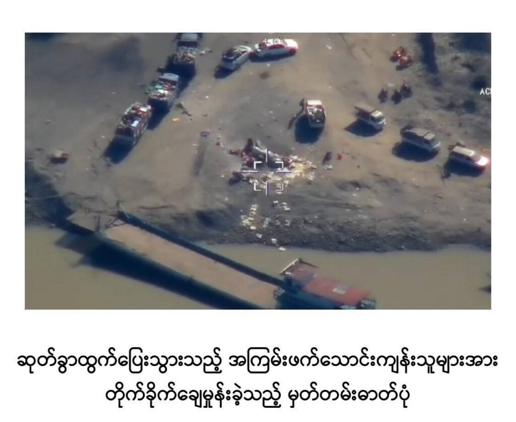 စဉ့်ကူး၊ သပိတ်ကျင်းနဲ့ မတ္တရာနယ်ကနေ ဧရာဝတီမြစ်ကို ဖြတ်ကူးကာ စစ်ကိုင်းတိုင်းဘက် စစ်ဘေးရှောင် နေကြတဲ့ ပြည်သူတွေကို စစ်အုပ်စုက ဒီဇင်ဘာ ၁၆နဲ့ ၁၇ရက်တွေမှာ လိုက်လံ ဗုံးကြဲသတ်ဖြတ်ခဲ့စဉ်/Photo – MFP၊ ပေးပို့