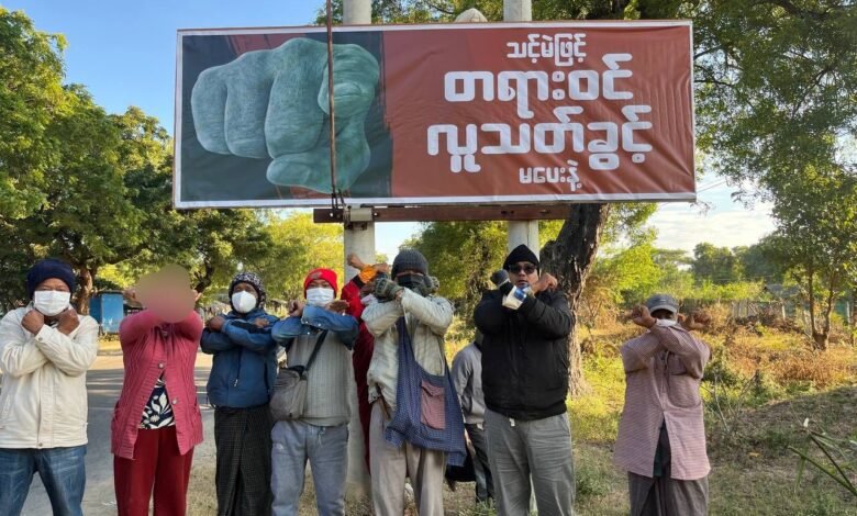 ဖက်ဆစ်တပ် ရွေးကောက်ပွဲ ဆန့်ကျင်ရေး လှုံဆော်တဲ့ ဗီနိုင်းဆိုင်းဘုတ်ကို ပြီးခဲ့တဲ့ ရက်ပိုင်းက မုံရွာ – ဘုတလင် ကားလမ်းဘေးမှာ သပိတ်အင်အားစုတွေက စိုက်ထူခဲ့စဉ်/Photo – ဘုတလင်မြို့နယ် သပိတ်