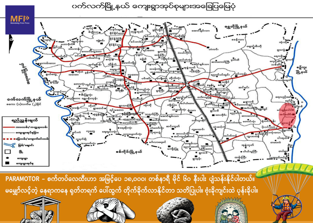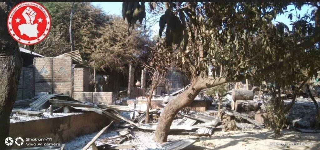 ဝက်လက်နယ် ရွာသစ်ရွာကို စစ်အုပ်စုက ဇန်နဝါရီ ၁ရက်ကနေ ၃ရက်အထိ စီးနင်းကာ အိမ်တွေ မီးရှို့ဖျက်ဆီးခဲ့မှုနဲ့ အာဏာသိမ်း စစ်အုပ်စု/Photo – CJ၊ စစ်အုပ်စု