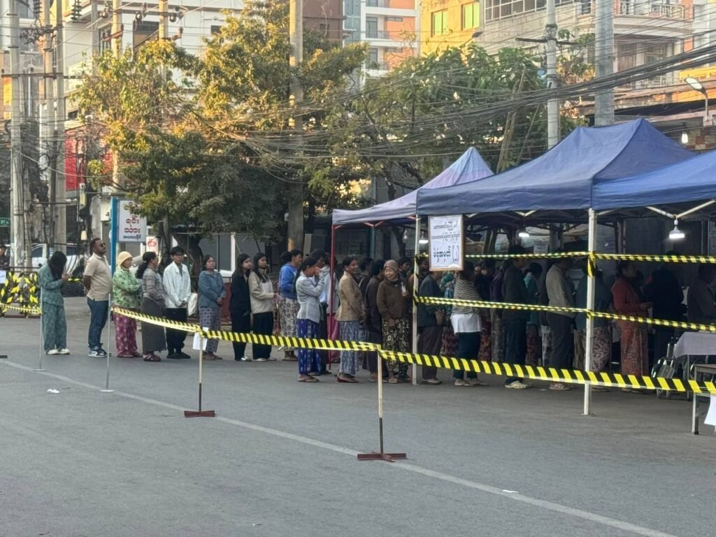 မန္တလေးမြို့ မဟာအောင်မြေမြို့နယ်အတွင်း စစ်အုပ်စုက လုပ်တဲ့ ရွေးကောက်ပွဲမှာ မဲရုံလာပြီး မဲပေးနေသူတွေ/Photo – စစ်အုပ်စု