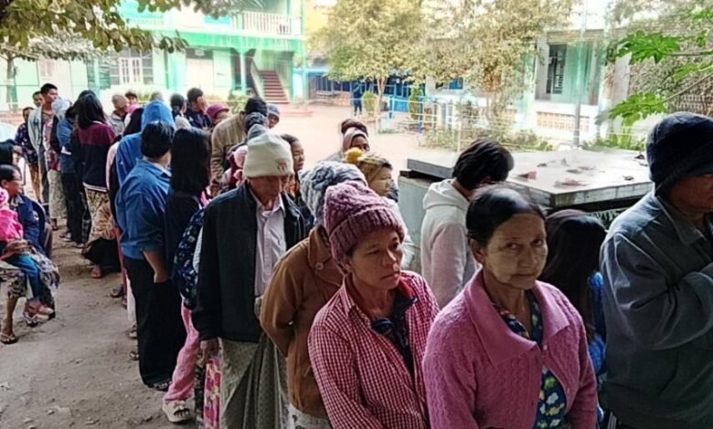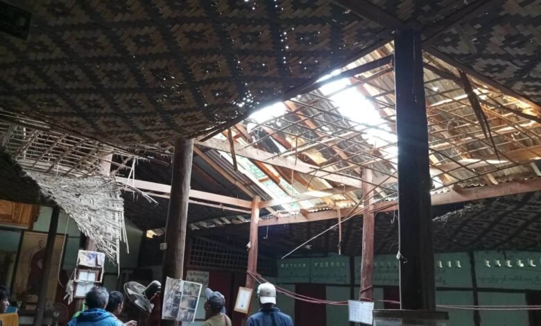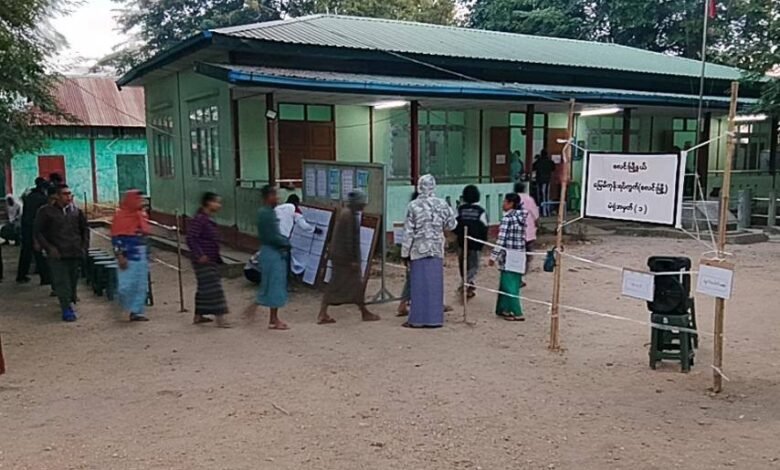 စလင်းမြို့မှာ စစ်အုပ်စု လုပ်တဲ့ အယောင်ပြ ရွေးကောက်ပွဲ မဲထည့်နေသူတွေနဲ့ စစ်အုပ်စုက စလင်းနယ် ကျေးရွာတွေကို ဒရုန်းနဲ့ ဗုံးကြဲလို့ ထိခိုက်ပျက်စီးမှုတွေကို တွေ့ရစဉ်/Photo – စစ်အုပ်စု၊ CJ