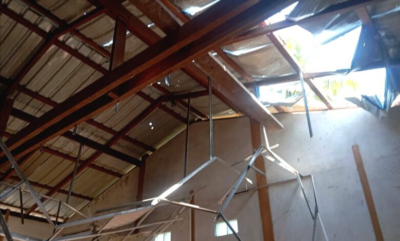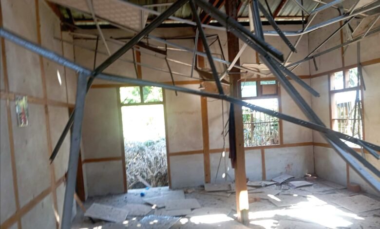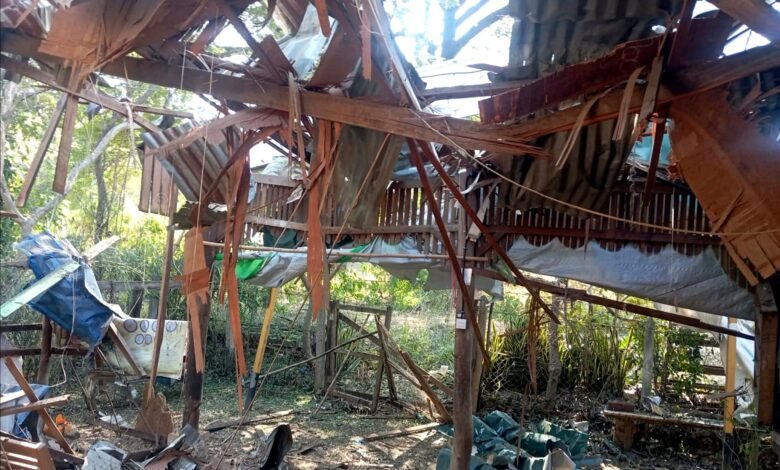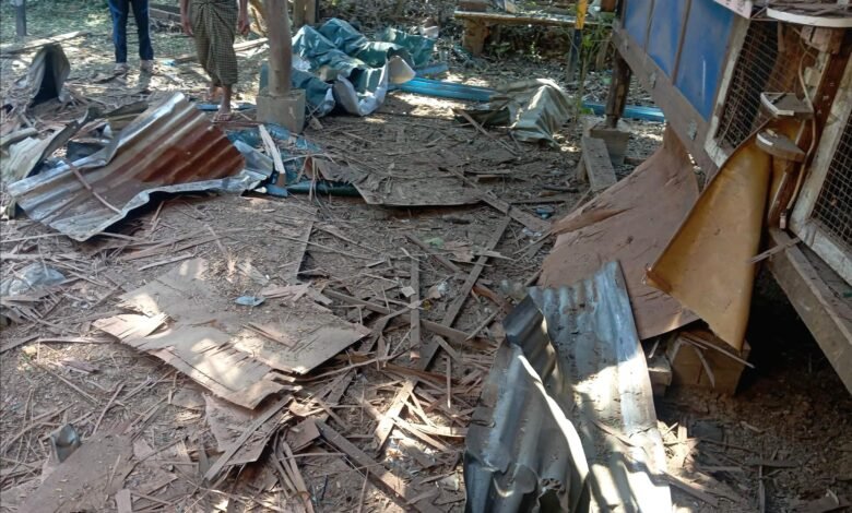 ကနီမြို့နယ် ရှမ်းမြောင်းကျေးရွာကို စစ်အုပ်စုက ဗုံးကြဲလို့ နေအိမ် ပျက်စီးစဉ်/Photo – Pyae Aung Naing