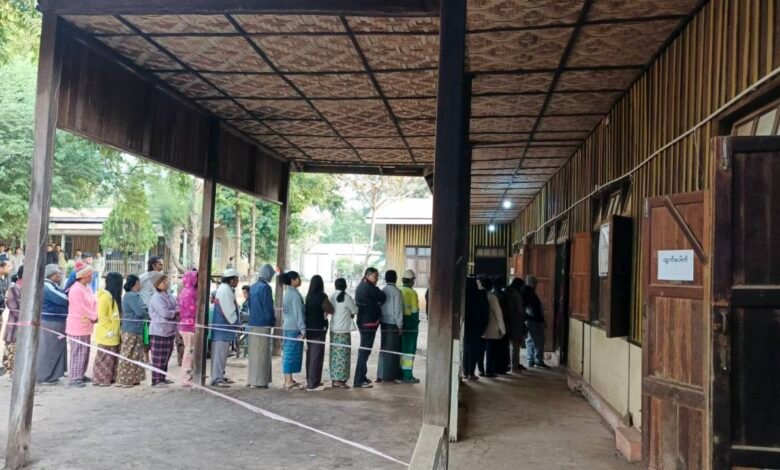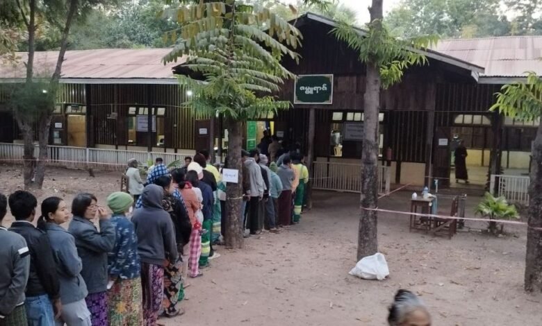 ဆားလင်းကြီးနယ်ထဲ တစ်ခုတည်းသော မဲရုံဖြစ်တဲ့ တရုတ်ပိုင် ယန်စီကုမ္ပဏီ မိုင်းမြို့ရှိ မဲရုံမှာ စစ်အုပ်စု လုပ်တဲ့ အတုအယောင် ရွေးကောက်ပွဲ မဲထည့်နေတဲ့ တရုတ်ကုမ္ပဏီ ဝန်ထမ်းတွေ/Photo – စစ်အုပ်စု