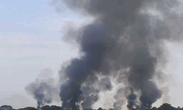မြင်းခြံမြို့အနီး မြစ်ရိုးတလျောက်ရှိ ဒါးကျွန်းနဲ့ ပြည်တော်သာကျေးရွာ အပါအဝင် ကျေးရွာ ငါးရွာကို စစ်အုပ်စုက တစ်နေ့တည်း မီးရှို့ဖျက်ဆီးလို့ နေအိမ်တွေ မီးလောင်နေစဉ်/Photo – CJ