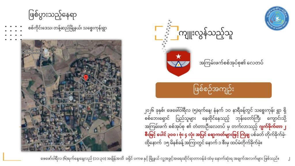 ဗုံးထိမှန်လို့ ကိုရင်တစ်ပါး အပါအဝင် ခြောက်ဦး သေဆုံးပြီး နောက်ထပ် ကိုရင်တစ်ပါးလည်း ရှာမရဘဲ ပျောက်ဆုံးနေတယ်လို့ အမျိုးသား ညီညွတ်ရေးအစိုးရ – NUG၊ လူ့အခွင့်အရေးဆိုင်ရာ ဝန်ကြီးဌာန – MOHR ကလည်း သတင်း ထုတ်ပြန်ပါတယ်။