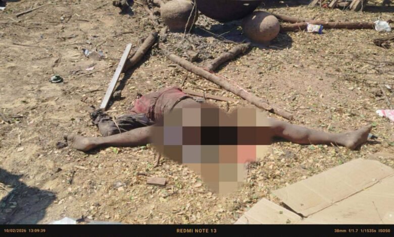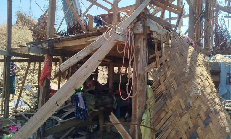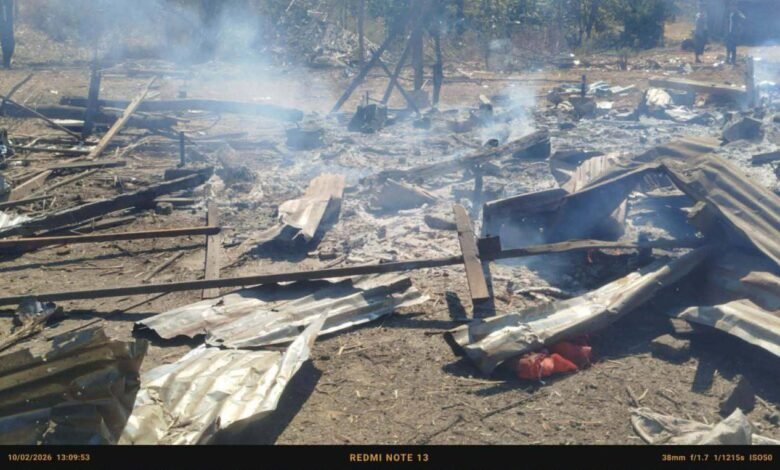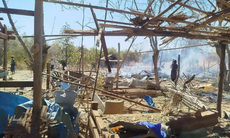 ပခုက္ကူခရိုင်၊ ပေါက်မြို့နယ် ချက်ကန်ကျေးရွာကို ဖေဖေါ်ဝါရီ ၁၀ရက် မနက်ပိုင်း စစ်အုပ်စုက တိုက်လေယာဉ် လေးစီးနဲ့ ဗုံးကြဲလို့ ထိခိုက်ပျက်စီးမှုနဲ့ ဒဏ်ရာရသူတွေကို တွေ့ရစဉ်/Photo – ဒေသခံ