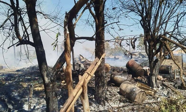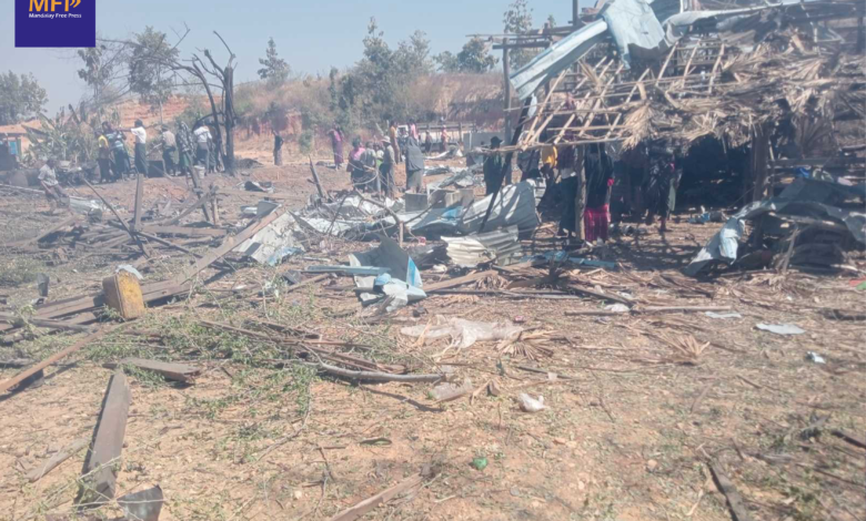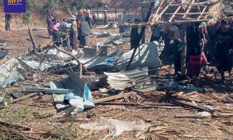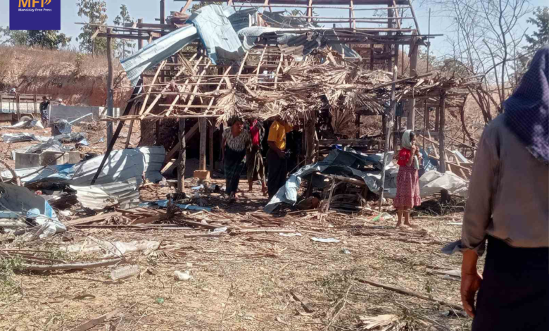 ပခုက္ကူခရိုင်၊ ပေါက်မြို့နယ် ချက်ကန်ကျေးရွာကို ဖေဖေါ်ဝါရီ ၁၀ရက် မနက်ပိုင်း စစ်အုပ်စုက တိုက်လေယာဉ် သုံးစီးနဲ့ ဗုံးကြဲလို့ ထိခိုက်ပျက်စီးမှုကို တွေ့ရစဉ်/Photo – ပေးပို့
