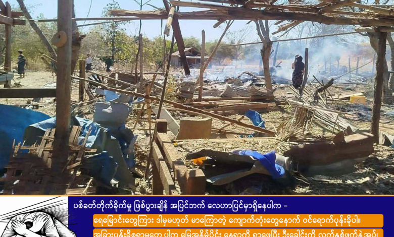 မကွေးတိုင်း၊ ပခုက္ကူခရိုင်၊ ပေါက်မြို့နယ်တောင်ပိုင်းရှိ ချက်ကန်ကျေးရွာကို မနေ့က မနက်ပိုင်း အာဏာသိမ်း စစ်အုပ်စုက ဂျက်ဖိုက်တာ တိုက်လေယာဉ် သုံးစီးနဲ့ ဗုံးကြဲချခဲ့ရာ ပြည်သူ ငါးဦးရဲ့ အလောင်းသာ ရှာတွေ့ပြီး အလောင်းရှာမရဘဲ ပျောက်ဆုံးနေသူတွေလည်း ရှိတယ်လို့ ဒေသခံ သတင်းရင်းမြစ်တွေက MFP ကို ပြောပါတယ်။