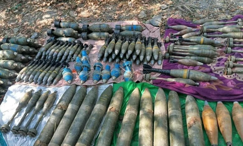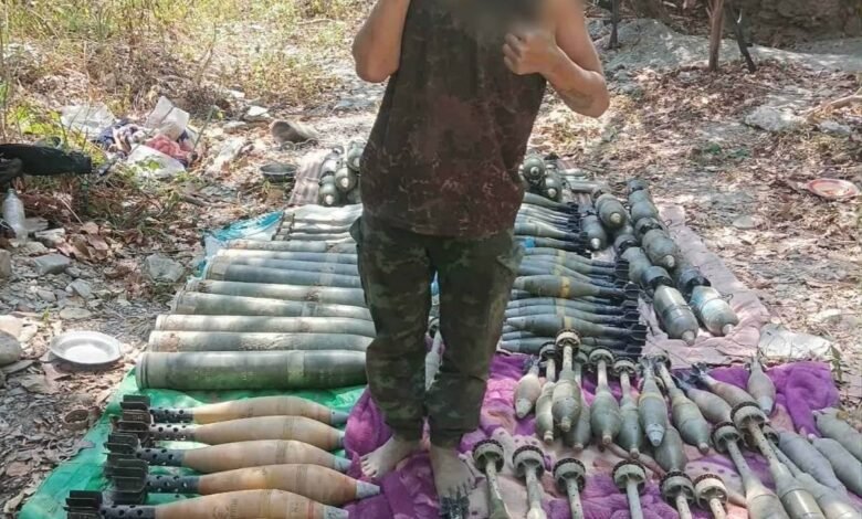 ဖလမ်းမြို့ဘက် ထိုးစစ်ဆင်တဲ့ စစ်အုပ်စုကို ဖေဖေါ်ဝါရီ ၁၃ရက်က တိုက်ခိုက်ရာ သိမ်းဆည်း ရရှိတဲ့ လက်နက်တွေနဲ့ ချင်းတော်လှန်ရေးတပ်တွေ ရှာဖွေတွေ့ရှိတဲ့ စစ်အုပ်စု ဝှက်ထားတဲ့ ခဲယမ်းတွေ /Photo – CJ