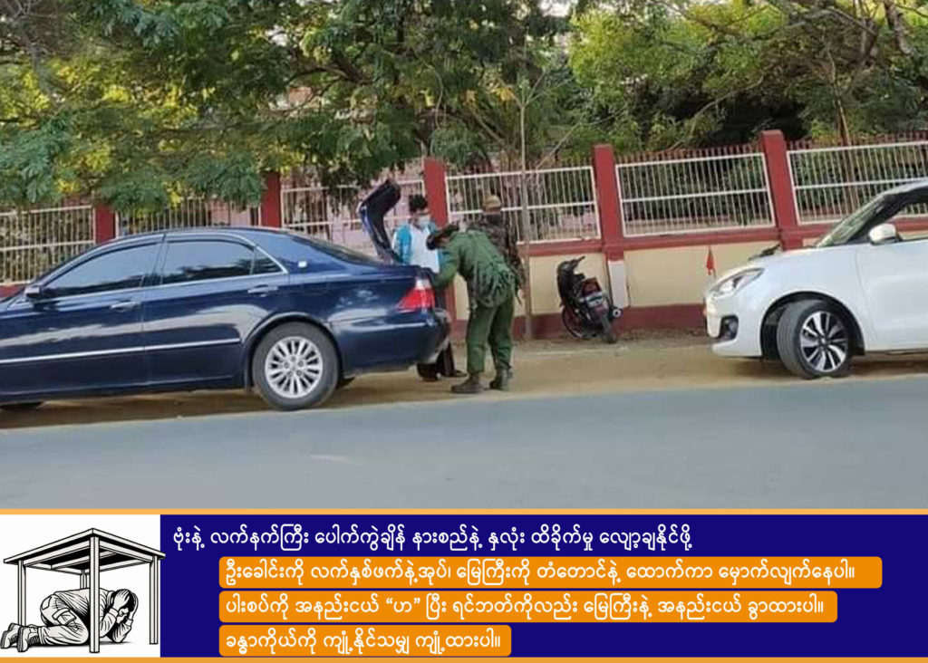 စစ်အုပ်စုက ယာဉ်စည်းကမ်း၊ လမ်းစည်းကမ်း စစ်ဆေးတဲ့သဘောမျိုး ဖြစ်စေဖို့ ယူနီဖောင်းဝတ် ယာဉ်ထိန်းရဲ လေးငါဒးယောက်ကို လမ်းဆုံတွေမှာ အယောင်ပြ ချထားကာ မျက်နှာဖုံးစွပ် အရပ်ဝတ် လက်နက်ကိုင်တွေက လမ်းကြားတွေထဲကနေ စောင့်ပြီး လာသမျှလူတိုင်းကို အလွတ်မပေးဘဲ တားဆီးငွေညှစ်၊ လက်နက်ပြ မိုက်ကြေးခွဲနေတာလို့ ကိုယ်တိုင်ကြုံရသူတွေက ပြောပါတယ်။