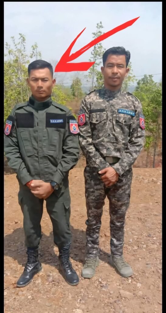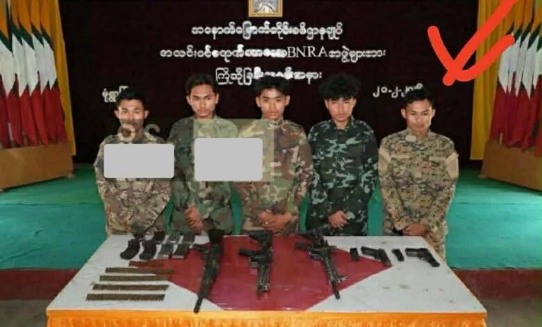 BNRA စစ်ရေးတာဝန်ခံ ကိုလတ်နဲ့ ဗိုလ်နဂါး၊ စစ်အုပ်စုထံ ဘက်ပြောင်းတဲ့ BNRA အဖွဲ့ဝင်တွေကို တွေ့ရစဉ်/Photo – စစ်အုပ်စု၊ CJ