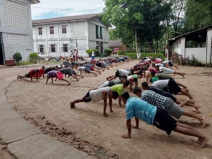 မန္တလေးကနေ ပေါ်တာဆွဲ ဖမ်းခေါ်လာတဲ့ လူငယ်တွေကို စစ်အုပ်စုက စစ်သင်တန်းပေးဖို့ ပြင်ဆင်နေစဉ်/Photo – စစ်အုပ်စု
