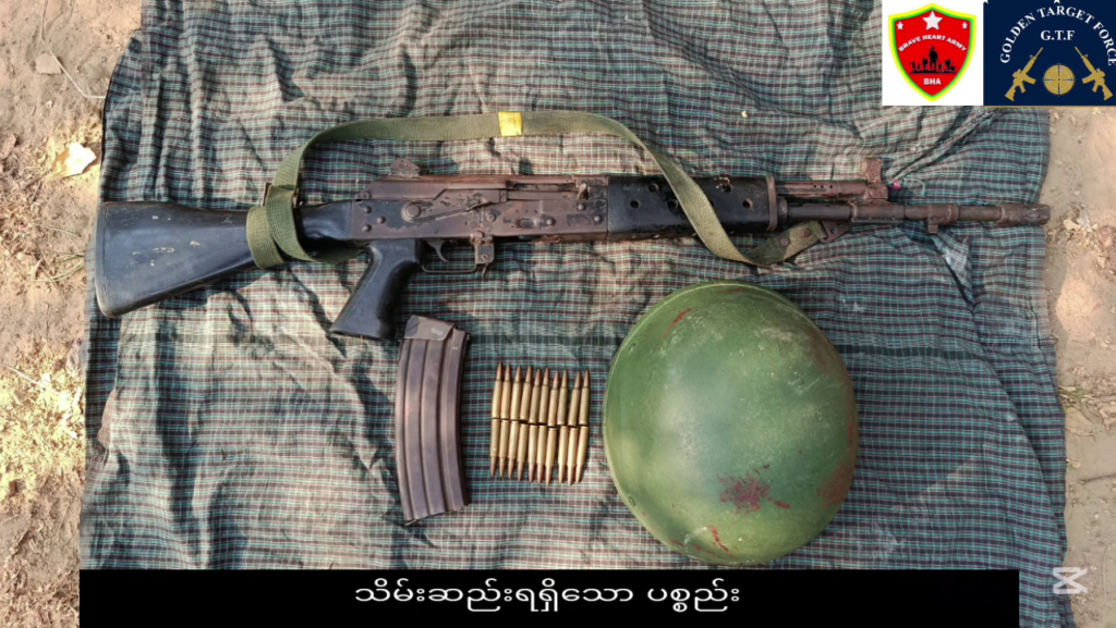 မုံရွာမြို့အနီး ကားလမ်းပေါ် စစ်အုပ်စုကို တိုက်ခိုက်ရာ သိမ်းဆည်းရရှိတဲ့ လက်နက်၊ အထိနာတဲ့ စစ်အုပ်စုက မုံရွာမြို့ရဲ့ တောင်ဘက်ရှိ ထနောင်းတော (မြောက်)ရွာကို စီးနင်းကာ ပစ်သတ်ခဲ့တဲ့ ပြည်သူတွေနဲ့ စစ်အုပ်စု ရန်ကြောင့် ထွက်ပြေးနေရတဲ့ ရွာခံပြည်သူတွေ/Photo – BHA၊ ပေးပို့