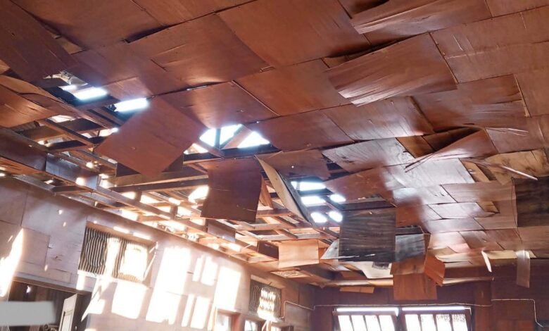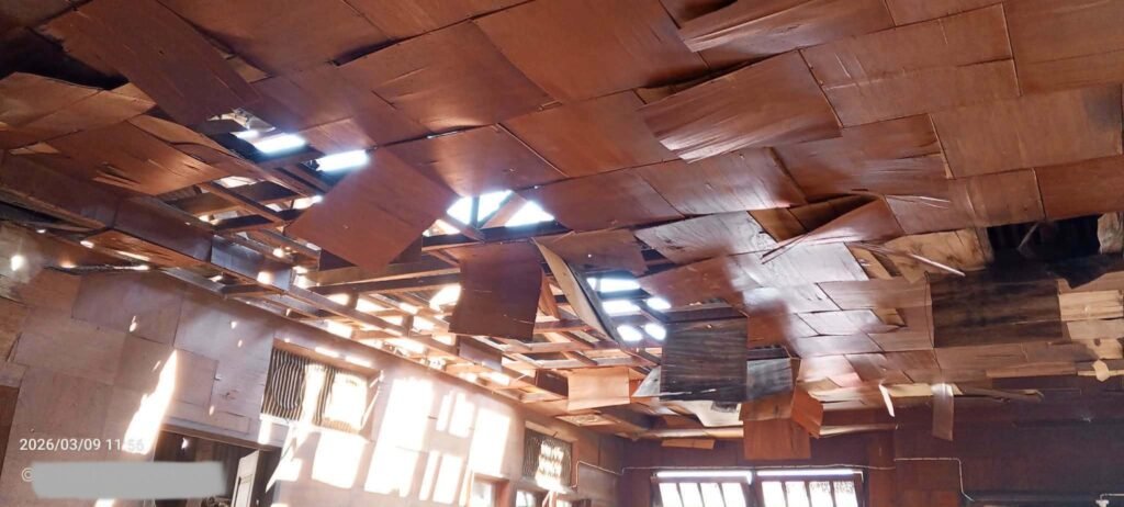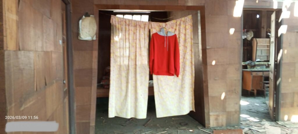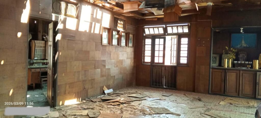 မတ်လ ၉ရက်က မိုးကုတ်မြို့ အနောက်ပိုင်း၊ ကျပ်ပြင်မြို့၊ ခေါင်းဦးဘာရပ်ကွက်ထဲ လက်နက်ကြီး ကျရောက်ပေါက်ကွဲလို့ နေအိမ်တွေ ထိခိုက်ပျက်စီးမှုကို တွေ့ရစဉ်/Photo – ပေးပို့