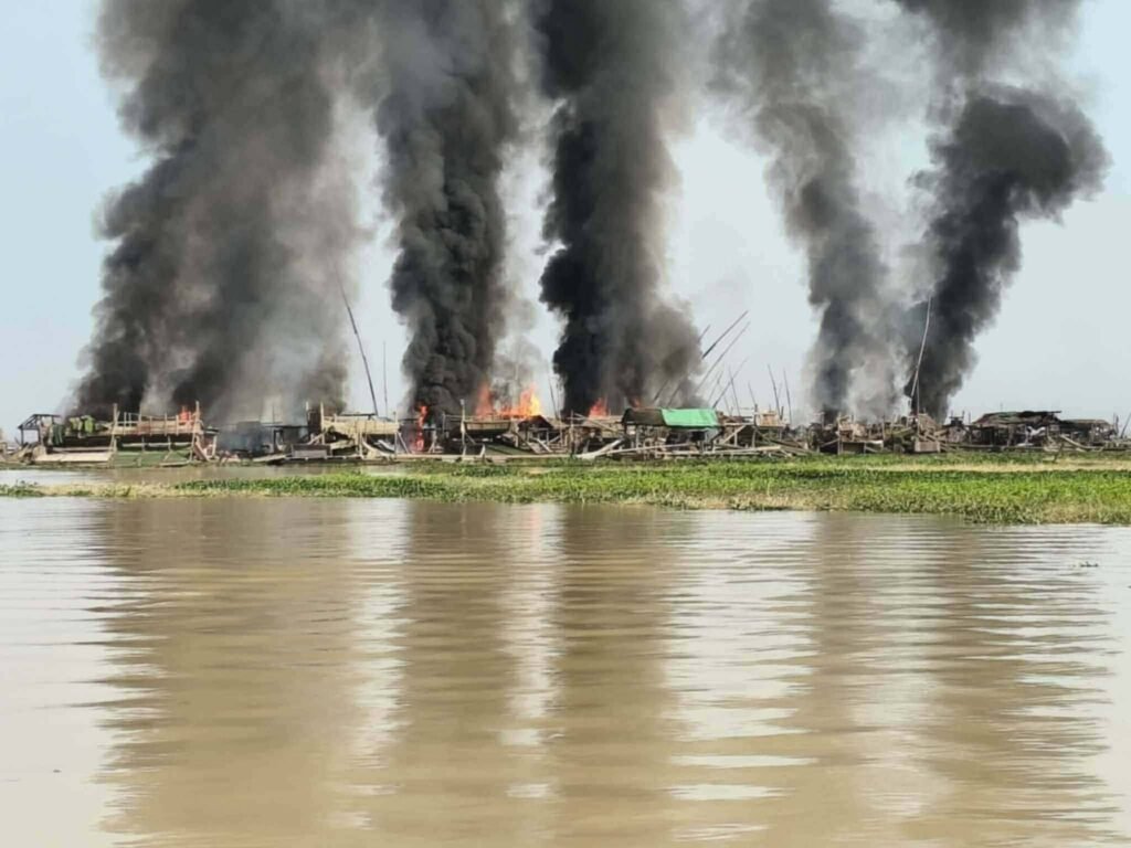ကျွန်းလှမြို့နယ် သဖန်းဆိပ်ဆည်ရှိ ရွှေမျောဖောင်တွေကို အာဏာသိမ်း စစ်အုပ်စုက မတ်လ ၁၅ရက်မှာ တိုက်လေယာဉ်နဲ့ ဗုံးပတ်ကြဲခဲ့စဉ်/Photo – Infinity Group၊ ကျွန်းလှတက်ကြွလှုပ်ရှားသူများ