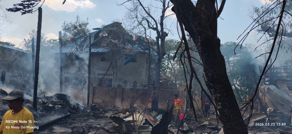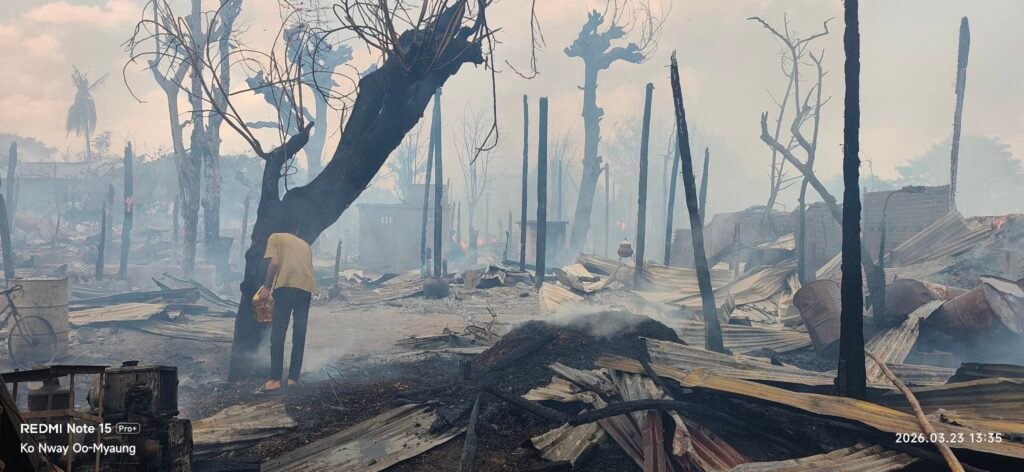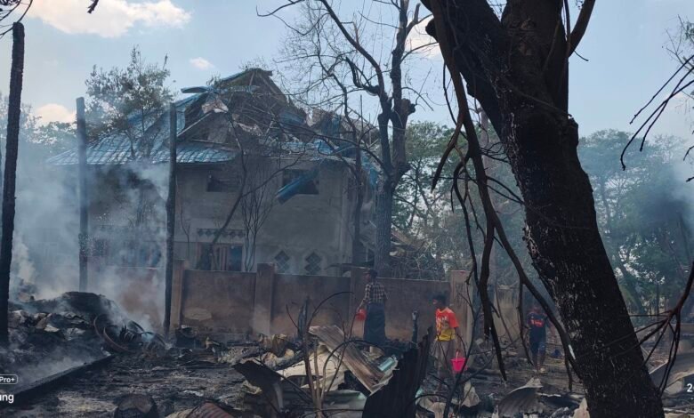 မတ်လ ၂၃ရက် ဒီကနေ့ မွန်းလွဲပိုင်း မြောင်နယ် သောင်ကြီးရွာကို စစ်အုပ်စုက ဗုံးပတ်ကြဲလို့ နေအိမ်တွေ မီးလောင်ကာ ရွာခံပြည်သူတွေ ထိခိုက်သေဆုံးစဉ်/Photo – ပေးပို့