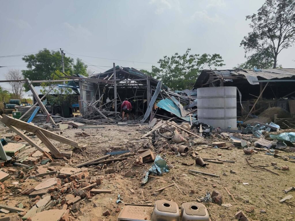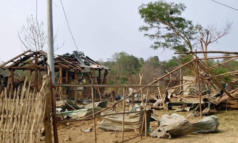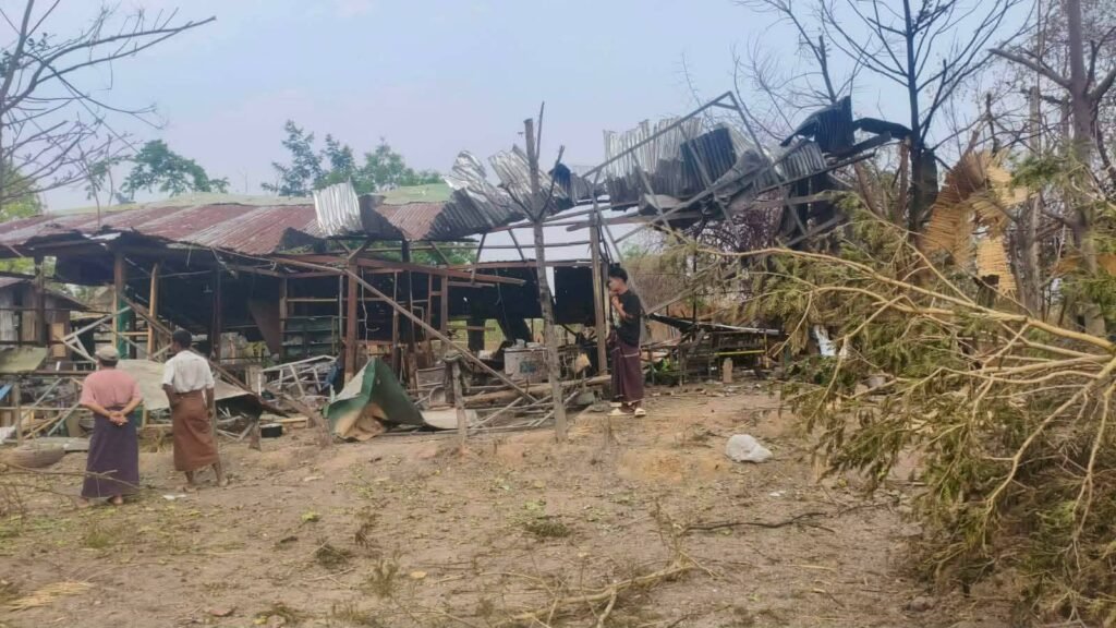 မကွေးတိုင်း ပခုက္ကူခရိုင်၊ ပေါက်နဲ့ မြိုင်နယ်အစပ် ကျေးရွာတွေကို စစ်အုပ်စုက တိုက်လေယာဉ် ငါးစီးနဲ့ ဗုံးပတ်ကြဲလို့ ထိခိုက်ပျက်စီးမှုတွေ တွေ့ရစဉ်/Photo – ဒေသခံ