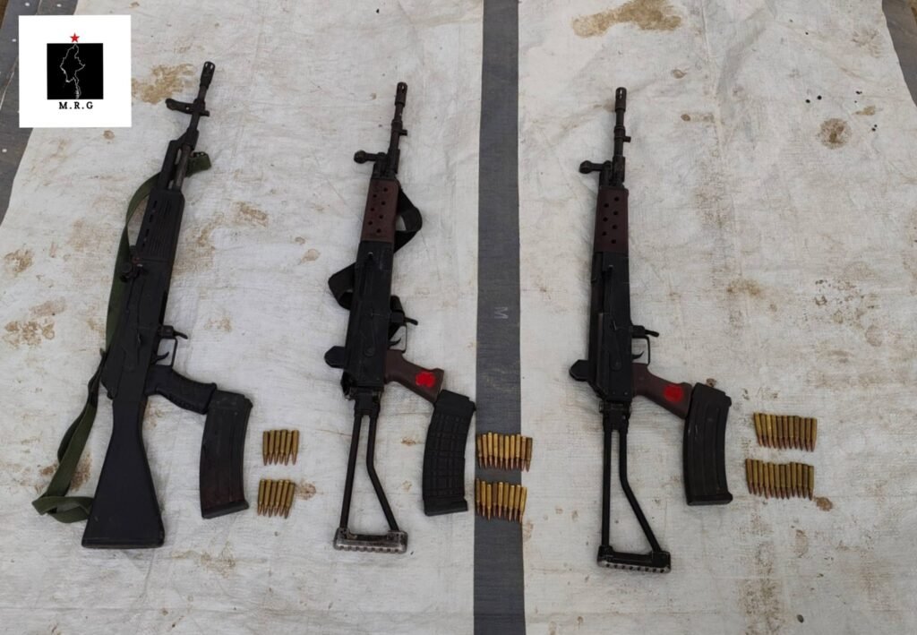 ပခုက္ကူမြို့ စက်မှုဇုန်ရိ စစ်အုပ်စု ငွေညှစ်ဂိတ်ကို တိုက်ခိုက်ရာက သိမ်းဆည်း ရရှိတဲ့ လက်နက်တွေ/Photo – မြေလတ်ဒေသပြောက်ကျားတပ်ဖွဲ့ M.R.G