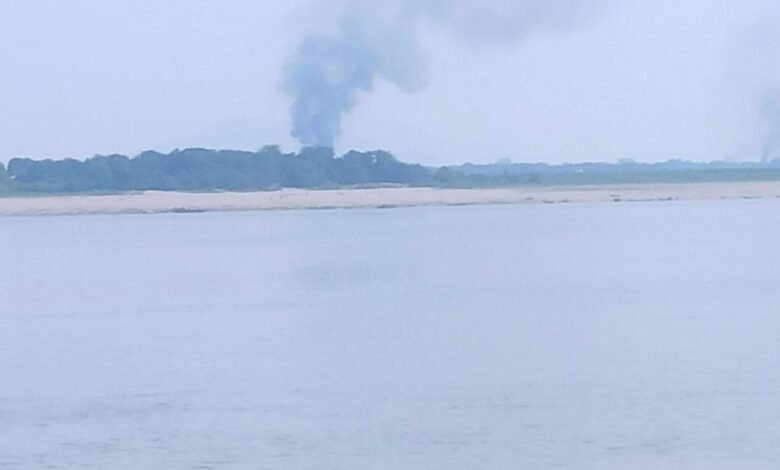 ဓာတ်ပုံ – CJ၊ မြင်းခြံမြို့ အနောက်ခြမ်း ဧရာဝတီမြစ်ကမ်းဘေးက ပတ္တာရွာနဲ့ နတ်ညွှန်းရွာတွေကို စစ်အုပ်စုတွေ မီးရှို့ဖျက်ဆီးနေစဉ်။