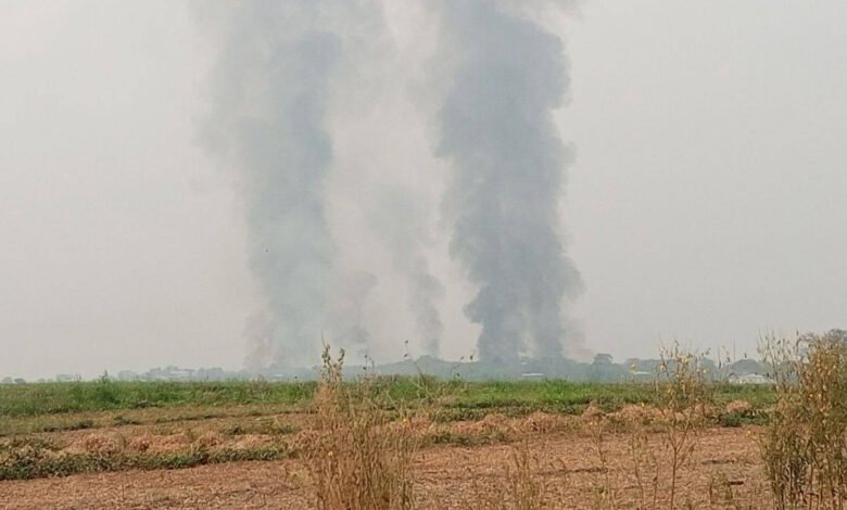 စစ်ကိုင်းတိုင်း၊ မြောင်မြို့နယ် ပန်းညိုရွာကို အခုနှစ် မတ်လက စစ်အုပ်စုဗုံးကြဲ မီးရှို့ပုံ။